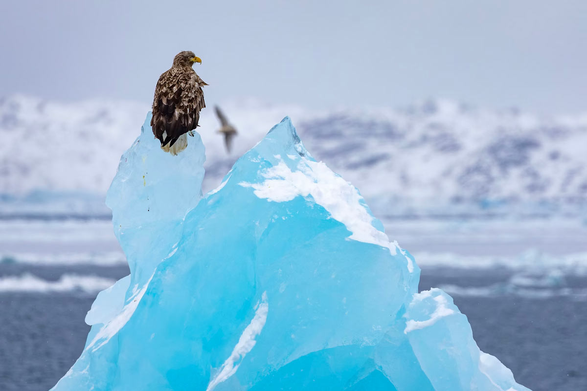 Орлан-белохвост, также известный как морской орел, сидит на айсберге, дрейфующем у берегов Нуука, 7 марта 2025 года. (Фото Odd Andersen):