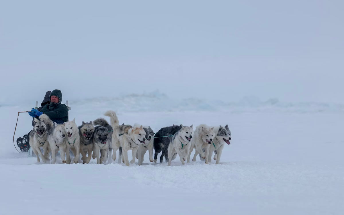 Ездовые собаки ждут своих хозяев, пока они ловят рыбу на льду в Илулиссате, 7 марта 2025 года. (Фото Joe Raedle):