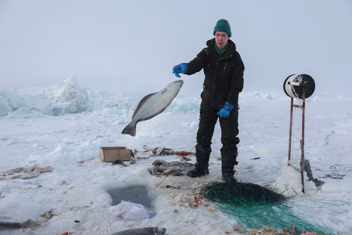 Ник Нильсен вытаскивает палтуса из рыболовной ямы недалеко от Илулиссата 7 марта 2025 года. (Фото Joe Raedle):