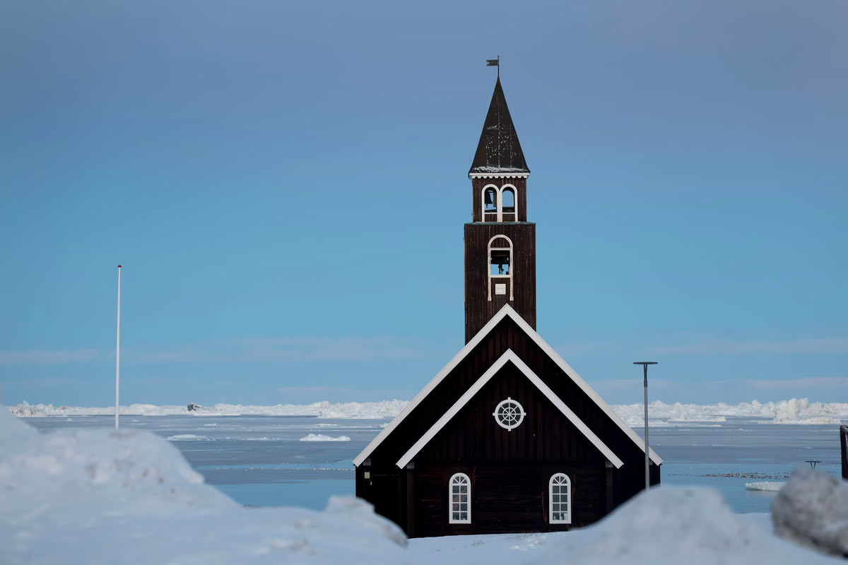 Церковь Сиона расположена рядом с айсбергами, дрейфующими в воде у берега, 8 марта 2025 года, в Илулиссате. (Фото Joe Raedle):