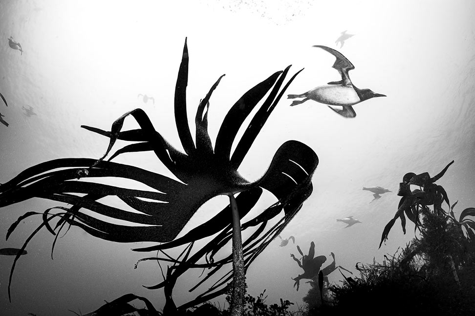 Королевство кайр. Черно-белое, победитель. «Фотографирование кайр под водой — сезонное развлечение для дайверов. В начале лета они собираются в огромных количествах вдоль скал побережья Берикшира, чтобы размножаться. Считается, что часто привлекаемые дайверами, они принимают поднимающиеся пузырьки за свой основной источник пищи — косяки крошечных песчанок. Добраться до подножия этих возвышающихся скал можно только на лодке, и в этот раз я отправился из Сент-Эббса. Более часа я оставался на одном месте среди водорослей на глубине восьми метров, терпеливо ожидая, когда их любопытство возобладает». (Фото © Mark Kirkland / British Wildlife Photography Awards):