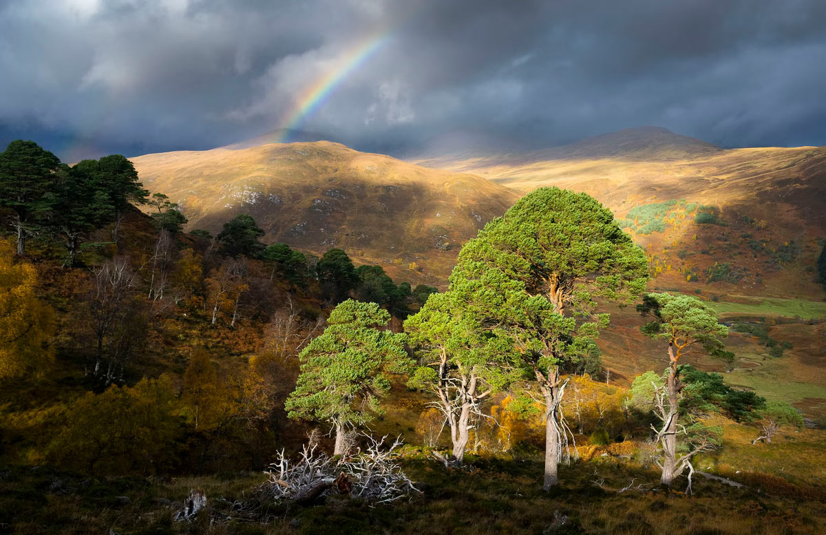 Штормовой свет над Каледонским лесом. Дикие леса, победитель. «Штормовые дни в Шотландском нагорье часто создают невероятные условия освещения для фотографии. Отправившись в место, где я никогда раньше не бывал, я сразу же был привлечен фотографическим потенциалом этих старых шотландских сосен. Преодолевая сильный дождь, я терпеливо ждал, надеясь на подходящий момент. Мое терпение было вознаграждено, когда внезапная вспышка света идеально осветила деревья, а за ними образовалась радуга — мимолетная, но волшебная сцена». (Фото © James Roddie / British Wildlife Photography Awards):