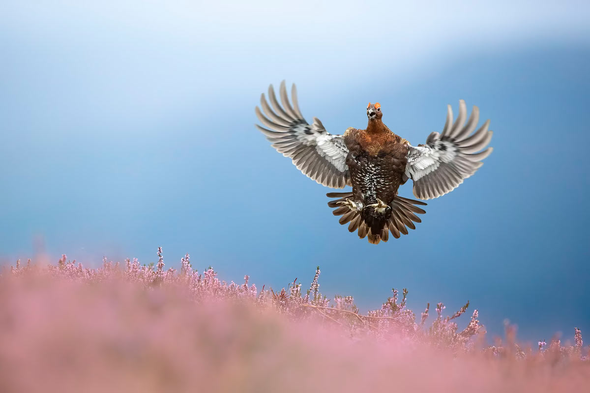 Красный тетерев приземляется. Портреты животных, второе место. «Я провел несколько дней, фотографируя красного тетерева, который часто встречается на пустошах Йоркшира. Находясь рядом с самцом тетерева, питающимся вереском, я сосредоточился на съемке его поведения, когда заметил вторую птицу, летящую в сторону. У меня было достаточно времени, чтобы сменить позицию, и мне удалось запечатлеть момент, когда он приземлился на вереске с расправленными крыльями». (Фото © Ben Hall / British Wildlife Photography Awards):