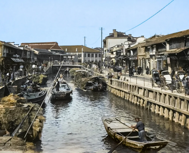 Гондольер (лодочник) на канале среди жилых домов города Венеции. Королевство Италия, 1900 год.