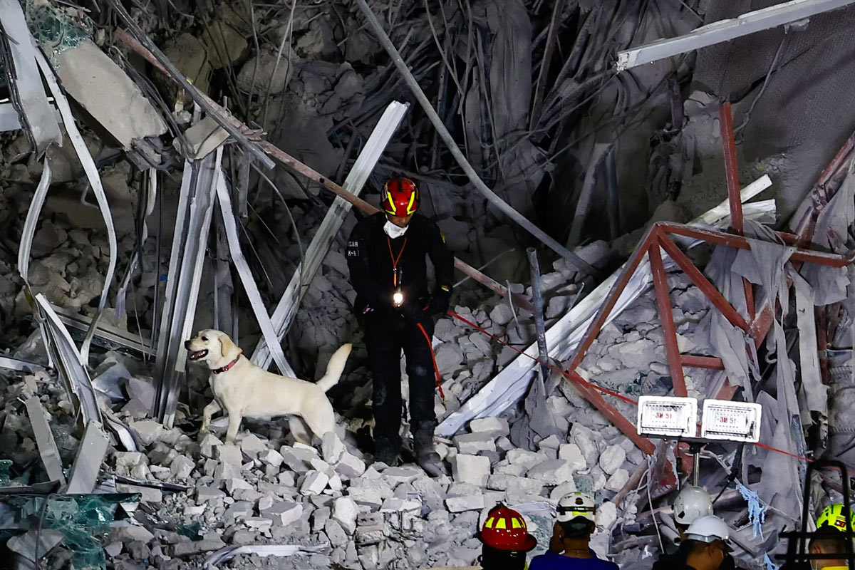 Спасатель и его поисковая собака готовятся к подъему в ковше экскаватора для поиска выживших на месте смертоносного взрыва, уничтожившего отель Saratoga в Старой Гаване, Куба, 8 мая 2022 года. (Фото Исмаэль Франциско):