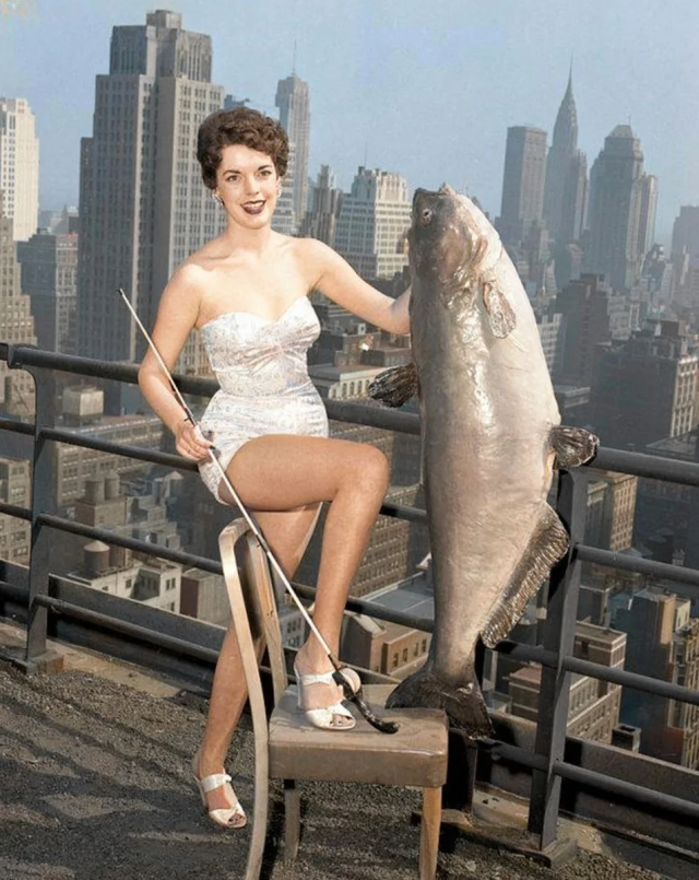 Мисс Национальная Королева сомов, 1945 год. Победительница и признанная королева сомов Гейл Хупер из штата Теннесси держит сома весом в 25 кг в отеле New Yorker, 1945 год.