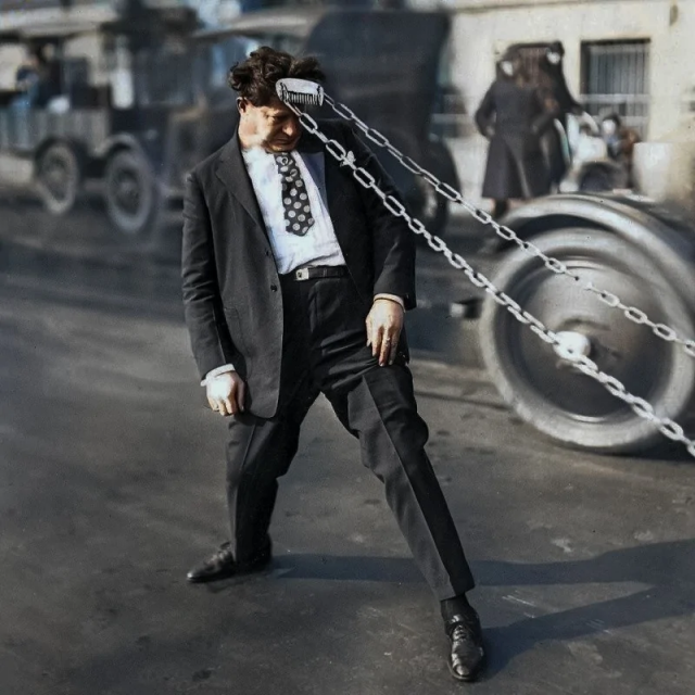 Американский силач Бен Дарвин демонстрирует силу своих волос, передвигая автомобиль весом около 2,5 тонн. Нью-Йорк, 1925 год.