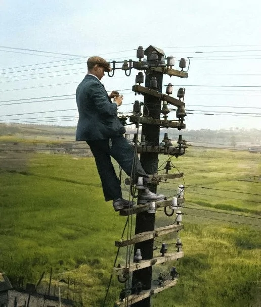 Линейный монтер, работающий на электрическом столбе, 1920-е.