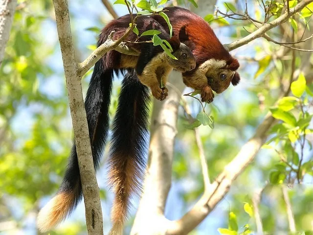 Яркий зверёк обитает в кронах деревьев и строит шарообразные гнезда из листьев и веток, чтобы избежать поимки леопардами и хищными птицами. Белка известна своим ярким разноцветным окрасом и тёмным пушистым длинным хвостом.