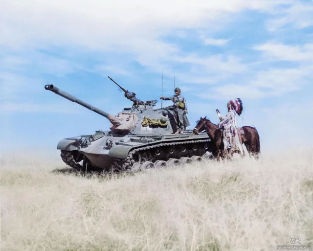 12. Глава Совета племён индейцев Якима навещает своего сына. Он проходил обучение в бронетанковой части армии в стрелковом центре Якима, штат Вашингтон, США, 1954 год.