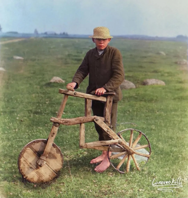 13. Юный изобретатель из Тарвасту, Эстония, на деревянном велосипеде собственного изготовления, 1912 год