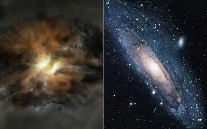 Галактики-каннибалы. Слева — W2246-0526, справа — галактика Андромеды