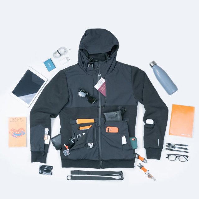 Худи, в которое можно упаковать буквально жизнь: в нём есть место для бутылки воды, планшета, бокалов, кошелька и даже тайников с защитой от считывания карт. Цена — от €99 (~9500 ₽). Вассерман одобряет! 😄