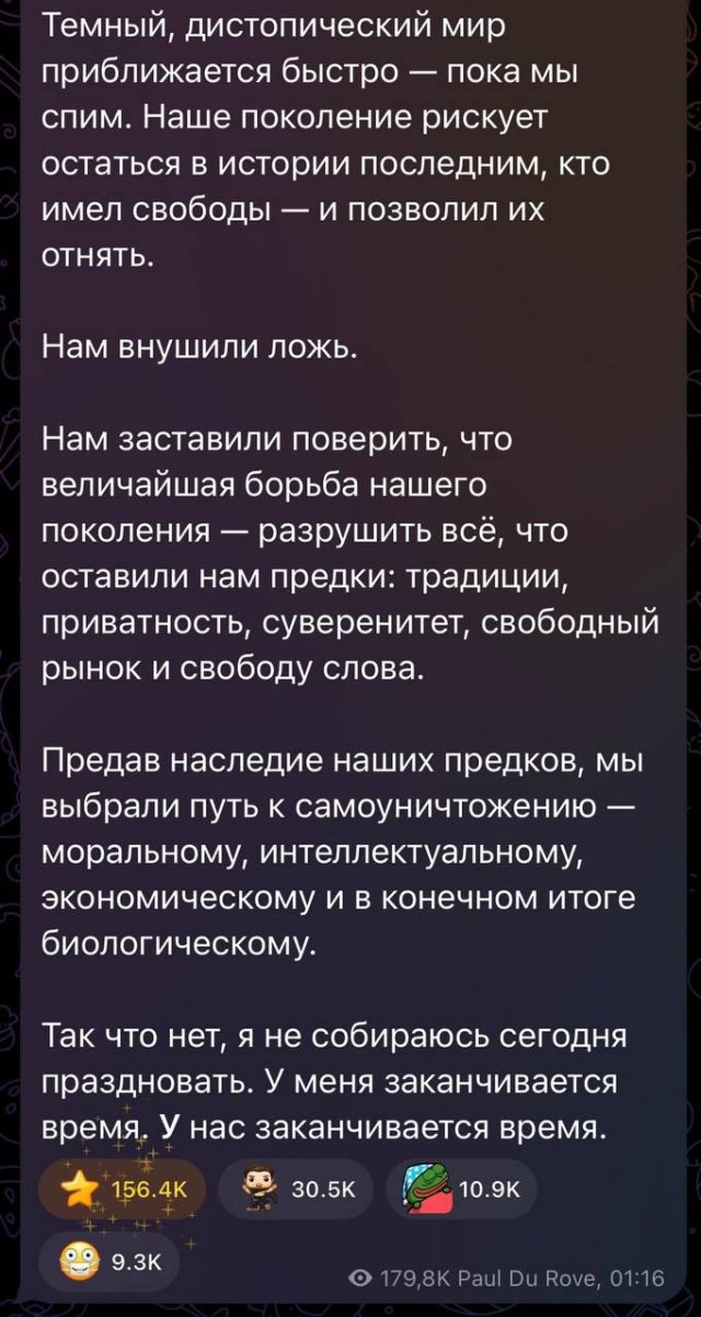 В свой день рождения создатель Telegram выложил пост, от которого мурашки. Пишет, что «время спасать свободный интернет заканчивается». Без вечеринок, без пафоса — просто тревожный сигнал о будущем сети.