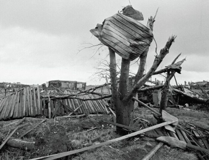 Дома и люди в воздухе Неподалеку от места, где ивановцы заметили смерч, паслось стадо коров. Позже очевидцы расскажут, что видели в небе кружащихся животных, и это не будет выдумкой. Хозяева долго искали своих буренок, а в течение последующих дней мертвых коров находили на обратном берегу реки в сотнях метров от пастбища. Да что там коровы. В небо тем днем взметнулись светофоры, машины, автобусы, деревянные дома. Неуправляемая черная воронка всасывала и уносила прочь мелкие водоемы, гаражи, крыши. Можно только представить силу смерча, сорвавшего и унесшего с водонапорной башни бак в 50 тонн и завязавшего в узел грузовой кран весом 350 тонн. А 70-тонные контейнеры с грузовой станции «Текстильная» позже находили в радиусе километра.