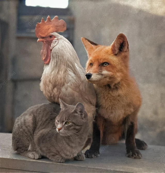 Кот, петух и лиса в одном вольере. Московский зоопарк, 1964 год.