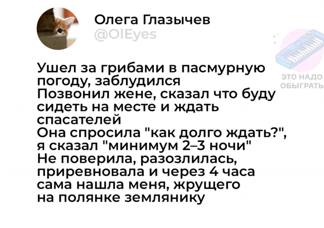 🍄 Немного грибного юмора для осеннего настроения 24/10/2025 22:50 Считается, что осенью грибы заканчиваются. А вот и нет! В это время в лесу ждут настоящие великаны — подосиновики, боровики и белые. Главное — не перепутать корзину для грибов с корзиной для мемов. Главная / Картинки 0 Admin 0 51
