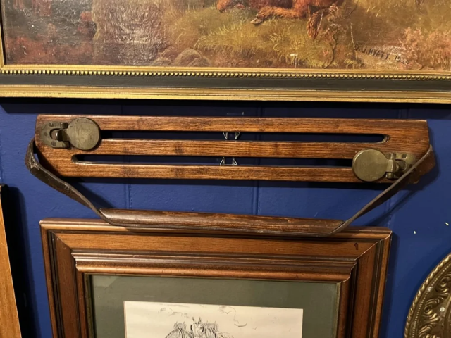 5. Деревянная конструкция длиной около 30 сантиметров с двумя латунными кольцами и ручкой, найдена в пабе в сельской Англии