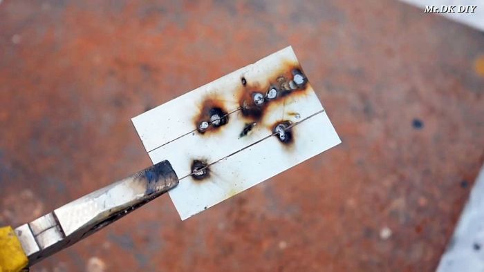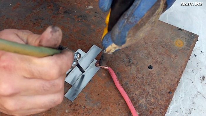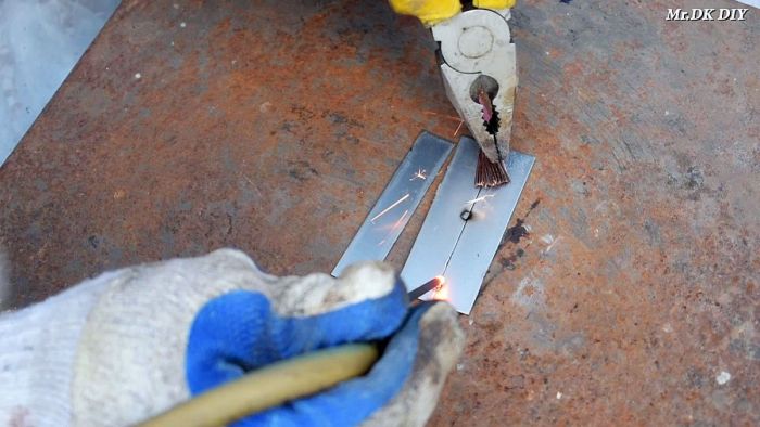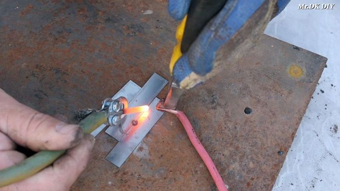 При касании графитовым стержнем к деталям, тот начнет разогреваться и плавить металл. От этого они будут свариваться между собой. Поначалу грифель обгорает, пока с него не сойдут остатки кислоты из батарейки, а потом варит лучше.