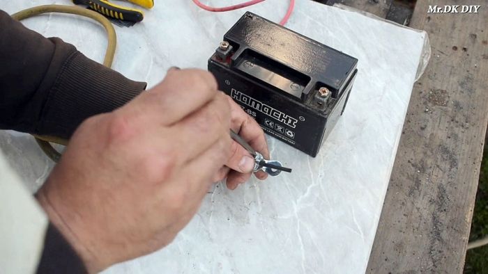 Такой способ сварки сопровождается коротким замыканием на аккумуляторе, что вызывает нагрев батареи. Если та закипит, то может взорваться. В связи с этим нельзя долго держать цепь замкнутой. Нужно делать паузы и периодически проверять температуру аккумулятора. В идеале его накрыть, чтобы в случае взрыва на тело не попали брызги кислоты. Вероятность этого очень мала, но перестраховка не помешает. Сварка забирает много энергии, поэтому одного заряда хватит буквально на пару минут.