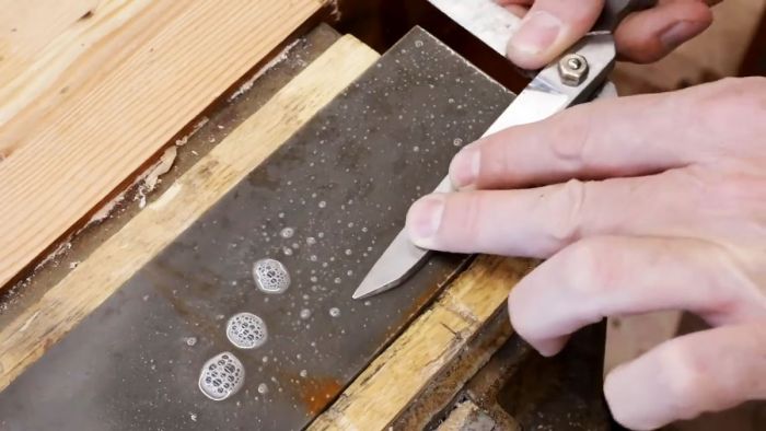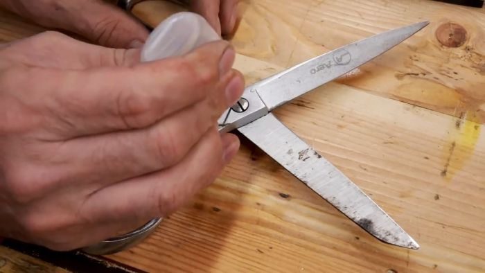 При наличии глубоких царапин и заусенцев, оставшихся после заточки, внутреннюю поверхность лезвий можно слегка подправить на плоском или круглом точильном камне с мелкой зернистостью, предварительно сбрызнув их водой. Особого усердия при этом проявлять не стоит.