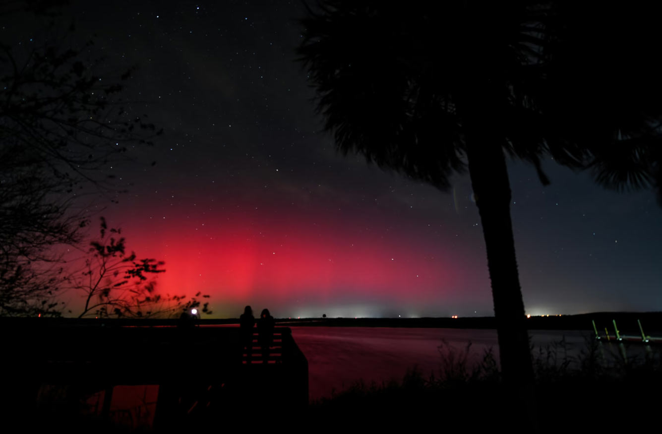 К западу от города Кокоа, штат Флорида, зрители наблюдают за северным сиянием над рекой Сент-Джонс. (Фото Craig Bailey / Florida Today):