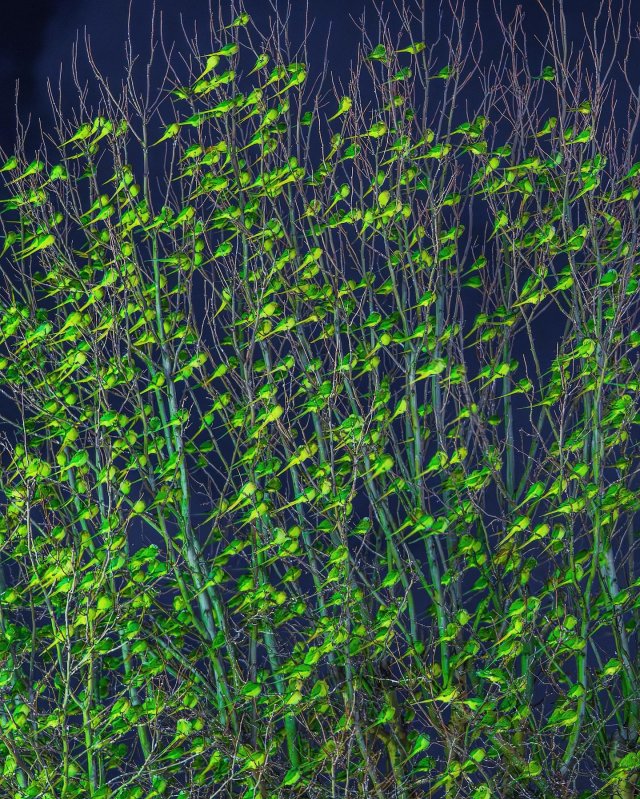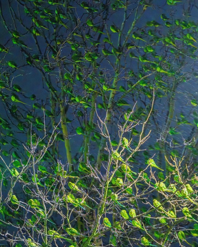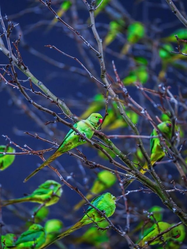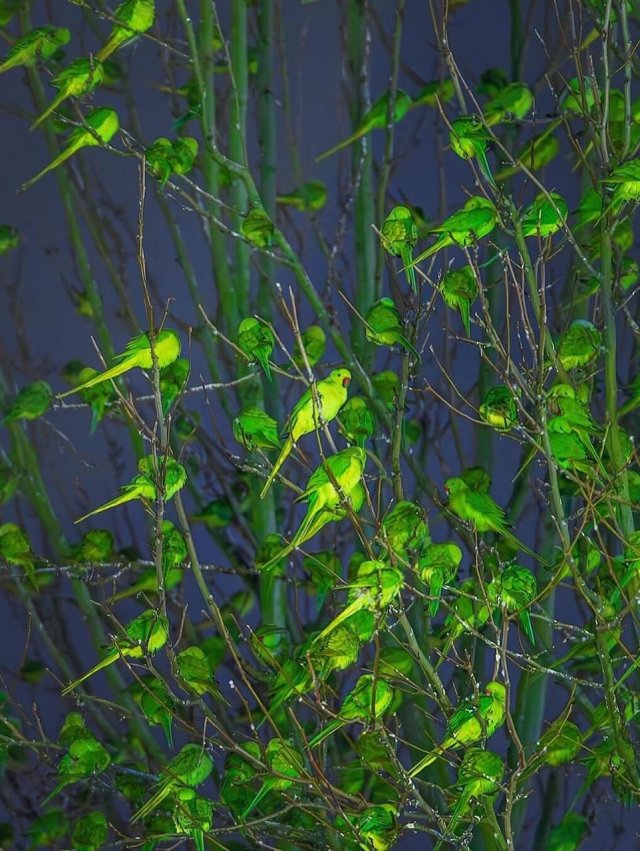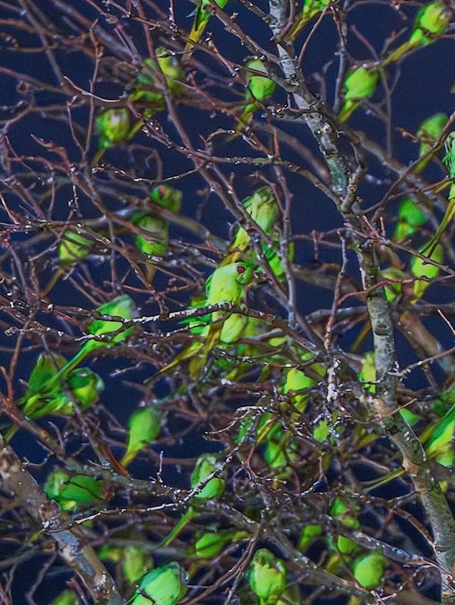 Оказывается дерефо было облеплено попугаями! Этот ярко-зеленый вид называется ожереловыми попугаями, и самое интересное, что все они не залетные гости, а настоящие жители Лондона — часто деревья зеленеют не листвой, а сотнями птиц.