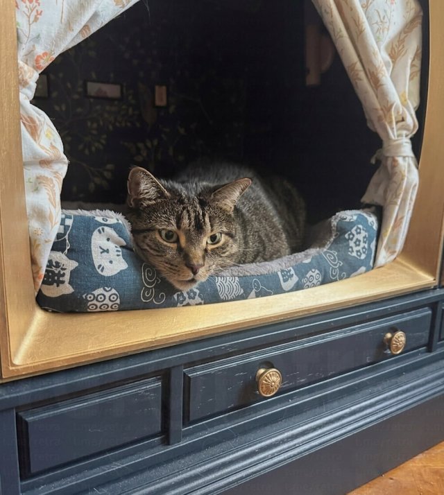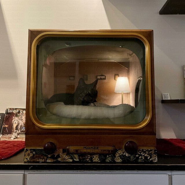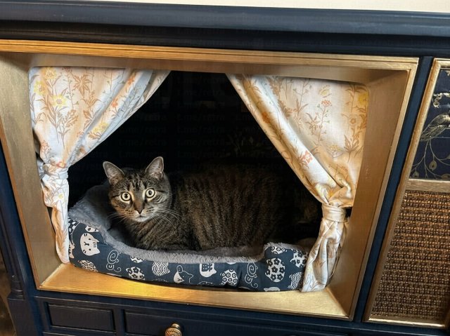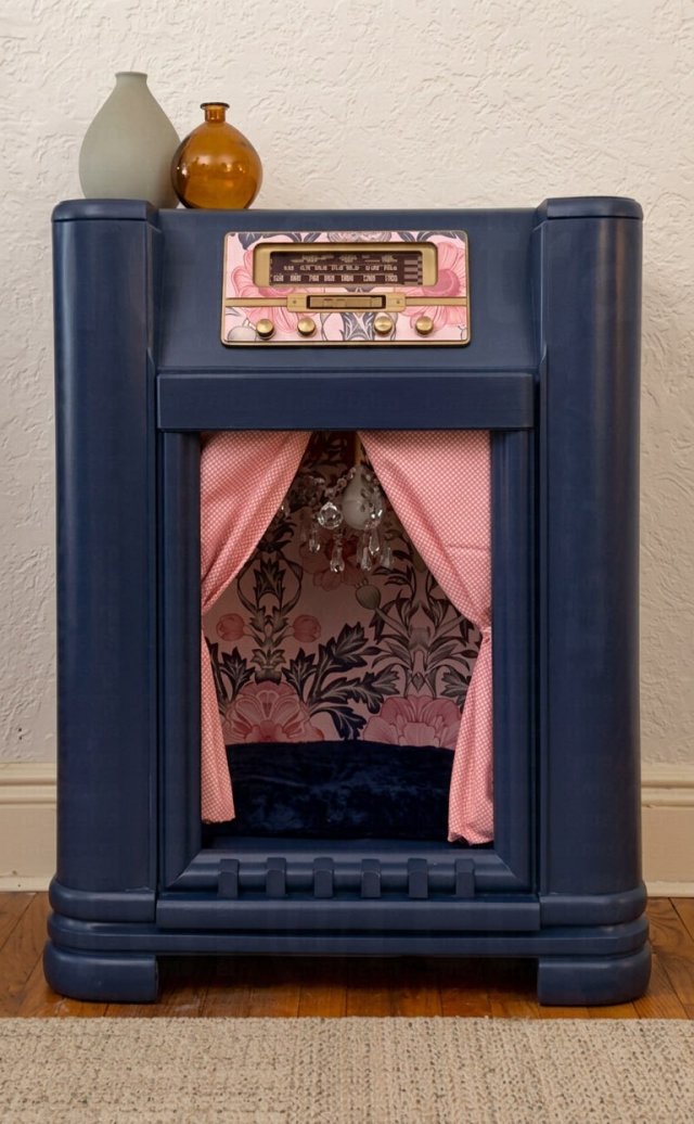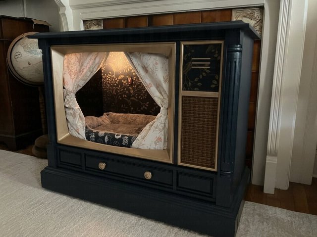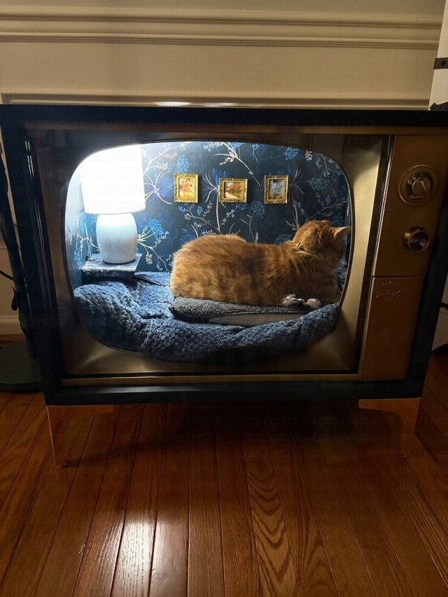 Снаружи это выглядит как старый телевизор или радиоприёмник, а внутри — мягкие подушки, безопасные материалы и даже подсветка. Получается не только удобно для питомца, но и стильно для интерьера.
