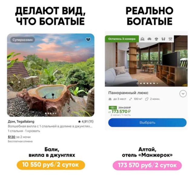 К примеру, аренда домика в Новосибирской области может стоить в несколько раз больше, чем апартаменты в Куршевеле. А двое суток на вилле на Бали — примерно в 15 раз дешевле, чем проживание в отеле на Алтае.