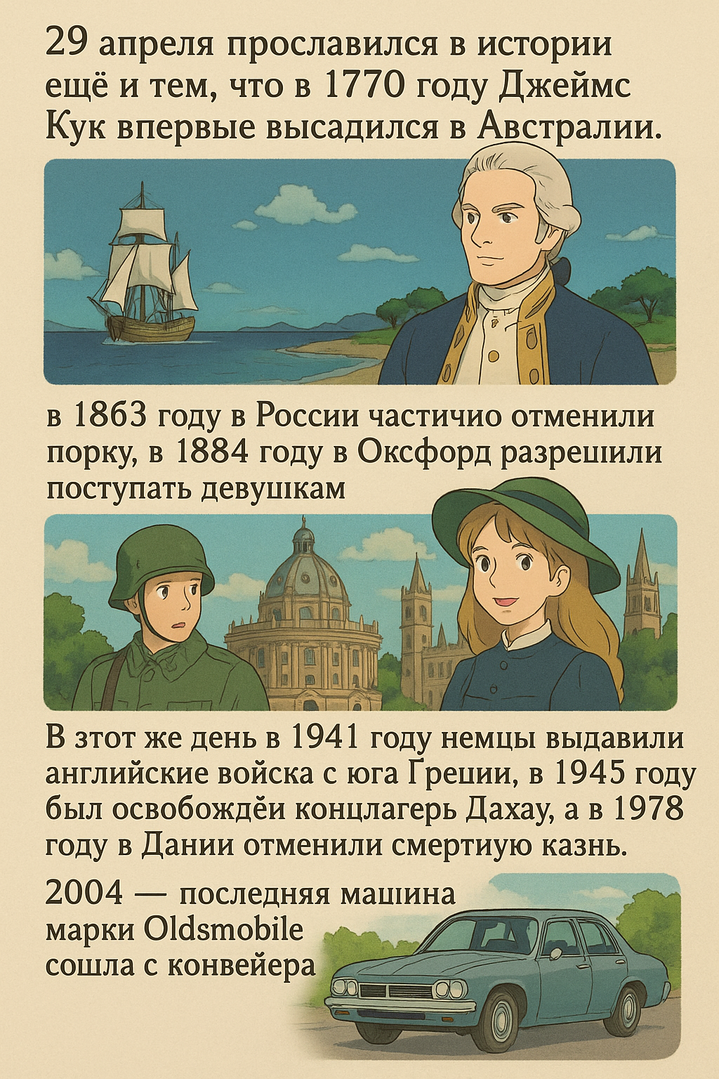 Но это еще не все! 29 апреля в истории — важные события: в 1770 году Джеймс Кук впервые ступил на австралийскую землю 🌏, в 1863-м в России частично отменили порку, в 1884-м в Оксфорде начали принимать девушек! 👩🎓 В 1918 году немцы оккупировали Украину, создав марионеточное государство, а в 1941-м вытеснили англичан с юга Греции 🇬🇷. В 1945-м был освобожден концлагерь Дахау, а в 1978-м в Дании отменили смертную казнь. И наконец, в 2004 году с конвейера сошла последняя машина Oldsmobile 🚗.