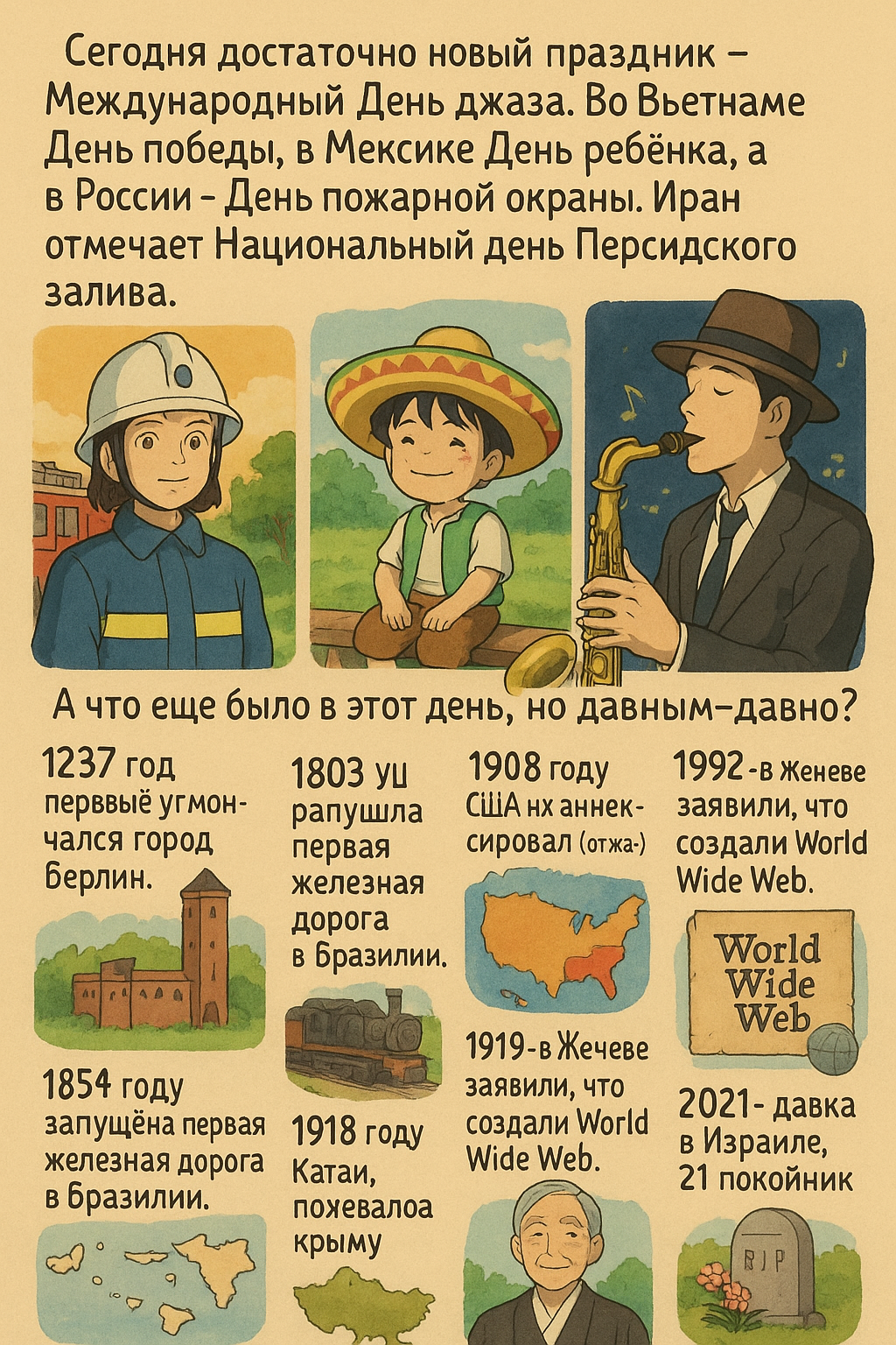 Сегодня отмечают Международный День джаза, во Вьетнаме День Победы, в Мексике — День Ребенка, в России — День Пожарной охраны, а в Иране — Национальный день Персидского залива. В этот день в 1237 году впервые упомянут Берлин, в 1803 году США купили Луизиану за 4 цента за акр, в 1854 году в Бразилии запустили первую железную дорогу, в 1900 году США аннексировали Гавайи, в 1918 году немцы создали Крымскую республику, в 1992 году в Женеве заявили о создании World Wide Web, в 2019 году Акихито отрекся от престола, а в 2021 году в Израиле произошла давка, унесшая жизни 21 человека.