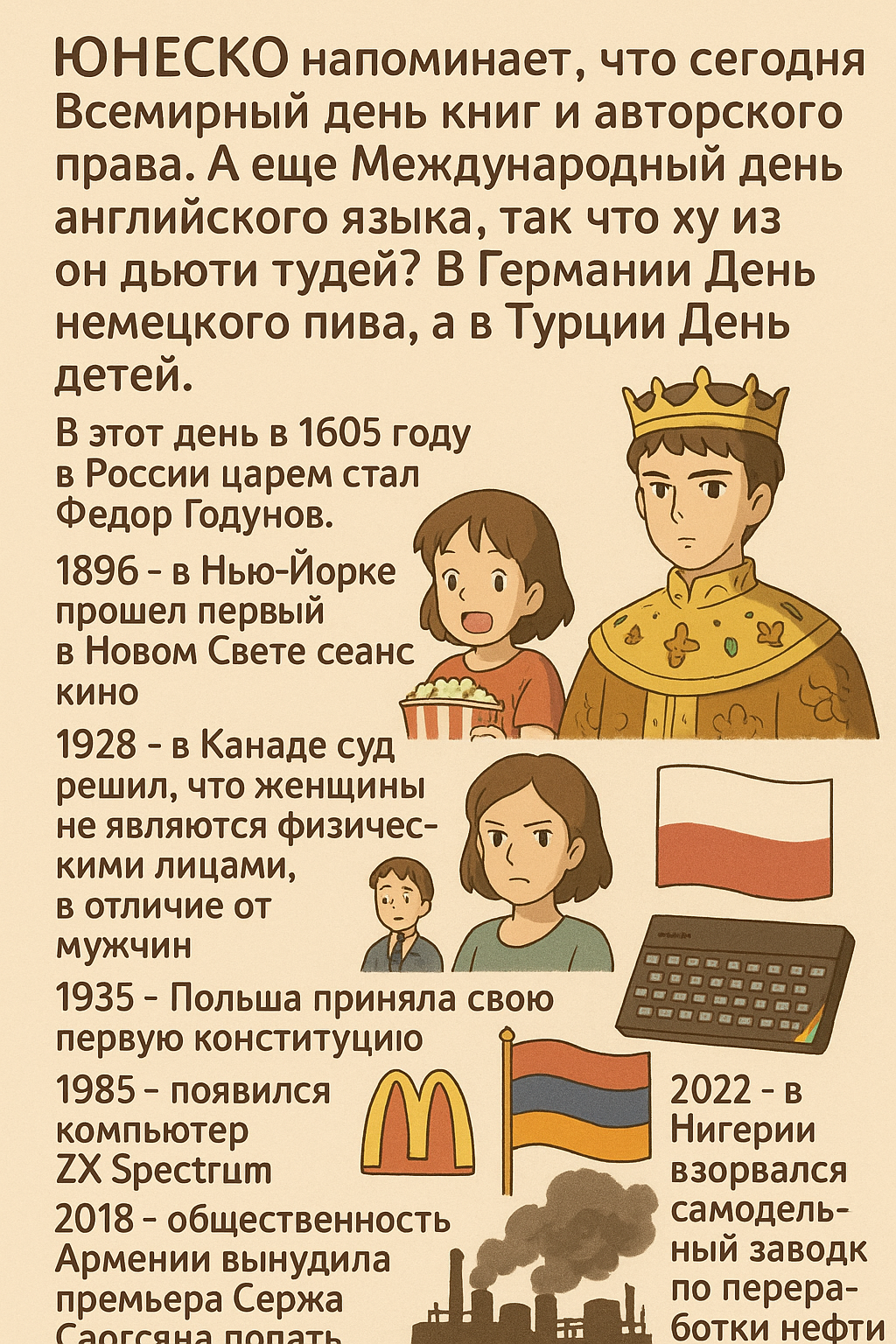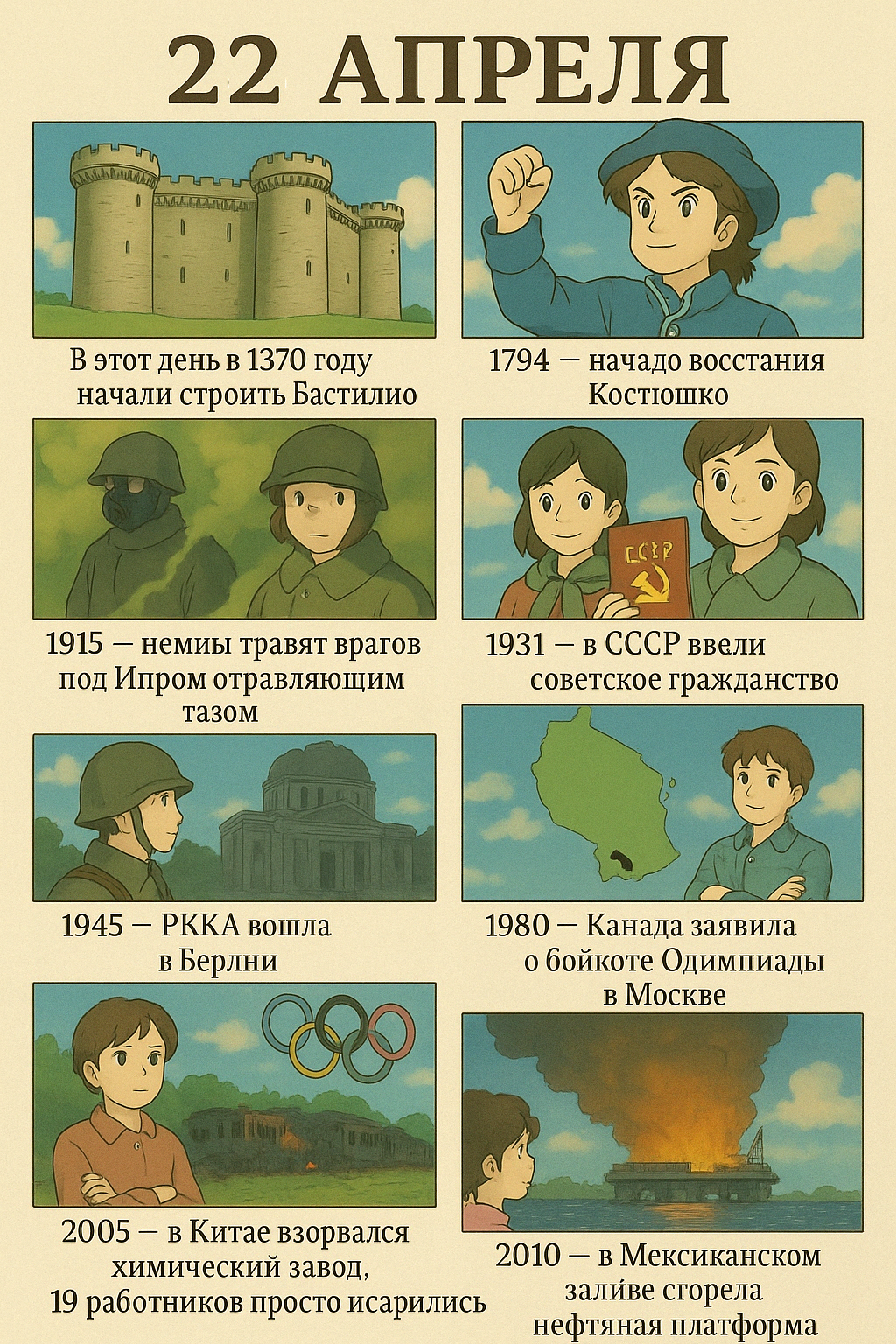 Что произошло в этот день в истории? 🤔 В 1370 году началось строительство Бастилии (и как потом все обернулось!). В 1794 году началось восстание Костюшко. В 1915-м немцы использовали химическое оружие под Ипром. В 1931 году в СССР было введено гражданство. В 1945 году РККА вошла в Берлин. В 1964 году образовалась Танзания – после объединения Танганьики и Занзибара. В 1980-м Канаду шокировал бойкот Олимпиады в Москве. В 2004 году в Северной Корее случилось страшное столкновение поездов – 150 жертв. В 2005 году в Китае взорвался химический завод, 19 человек исчезли. В 2010 году в Мексиканском заливе произошел пожар на нефтяной платформе.