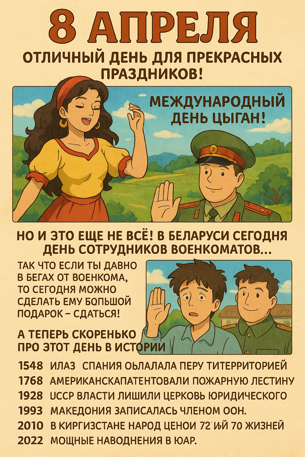8 апреля — день, полный праздников и интересных событий! Сегодня отмечаем Международный день цыган! Но и это ещё не всё! В Беларуси в этот день — День работников военкоматов. Так что, если ты всё ещё в бегах, то почему бы не сделать большой подарок и сдаться? 😉