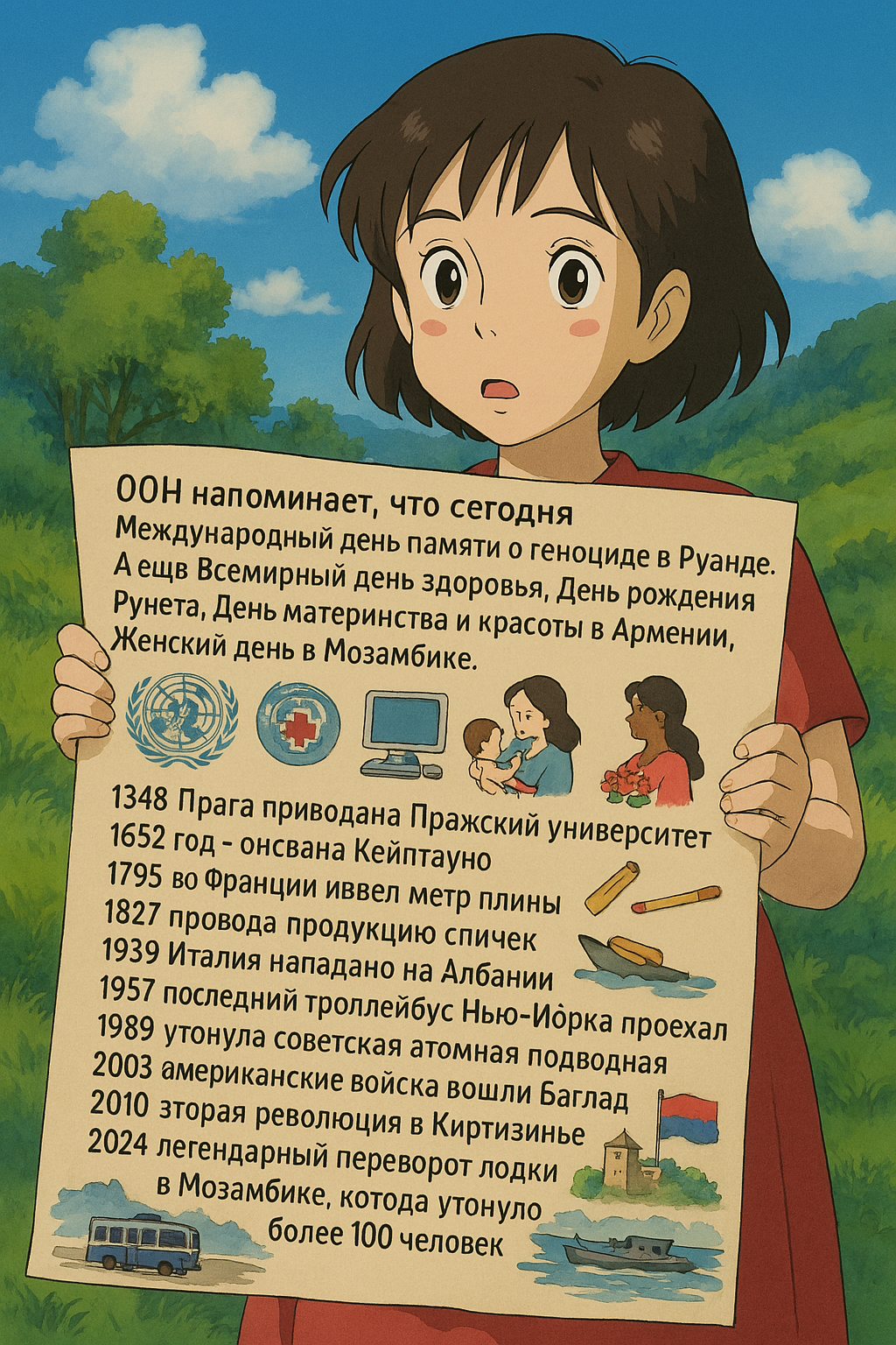 1️⃣ Международный день памяти о жертвах геноцида в Руанде. Это день, чтобы помнить и учить других о страшных страницах истории. 2️⃣ Всемирный день здоровья – напоминание о важности заботы о своем теле и разуме. 🧠💪 3️⃣ День рождения Рунета – празднуем развитие интернета и цифрового пространства в России! 🌐 4️⃣ День материнства и красоты в Армении, день, чтобы почитать женщин и их бесконечную красоту. 🌸 5️⃣ Женский день в Мозамбике – еще одна возможность поздравить женщин с их силой и стойкостью! 💕