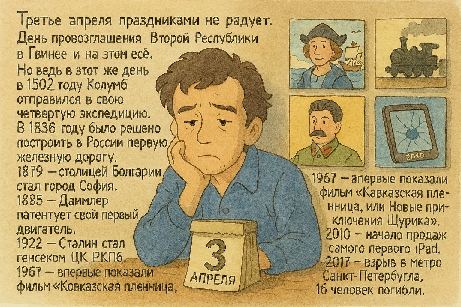 Однако, именно в этот день, в 1502 году, Христофор Колумб отправился в свою четвертую экспедицию. В 1836 году в России приняли решение о строительстве первой железной дороги. В 1879 году столицей Болгарии стал город София. В 1885 году Готлиб Даймлер запатентовал свой первый двигатель. В 1922 году Иосиф Сталин стал генеральным секретарем ЦК РКПб. В 1967 году был показан фильм «Кавказская пленница, или Новые приключения Шурика». В 2010 году началась продажа первого iPad. А в 2017 году произошел взрыв в Санкт-Петербургском метро, в результате которого погибли 16 человек.