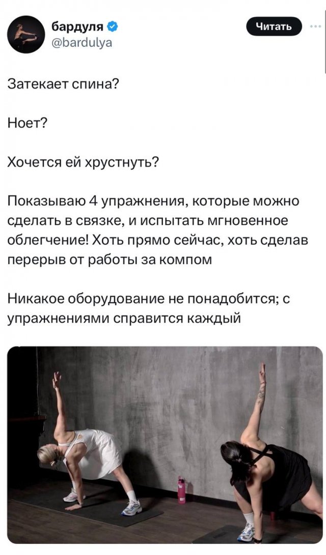 Неудивительно, если у вас часто затекает или ноет спина. В этом во многом виноваты современный образ жизни и сидячая работа. Чтобы избавиться от этих неприятных ощущений, нужно делать зарядку. Вот топ-4 упражнения для спины, которые снимут напряжение за пару минут.