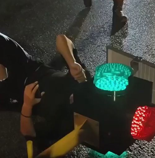 В Китае самокатчик влетел в светофор и застрял в нём головой — парень почти час играл роль регулировщика, пока не приехали спасатели.