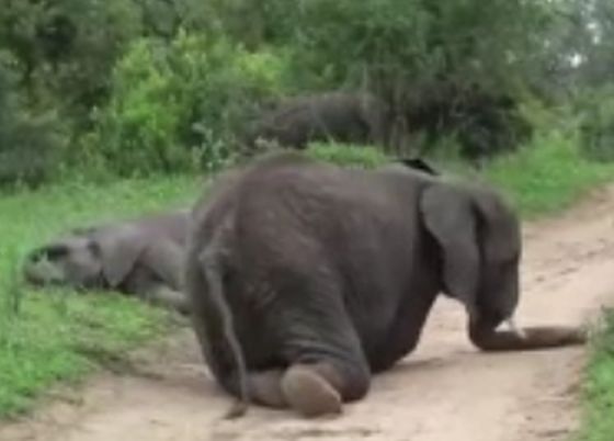 Они роют небольшую яму или находят готовую, затем накидывают туда плоды марулы до краёв, а потом чуть на них наступают. Далее солнечные лучи делают свою работу. Так получается бражка, которой упиваются слоны. А после - валяются на земле и балдеют.