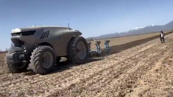 Беспилотные электрические тракторы используются на сельскохозяйственных угодьях Синьцзяна, Китай.