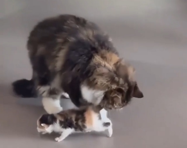 Мама-кошка ликует от первых шагов котенка