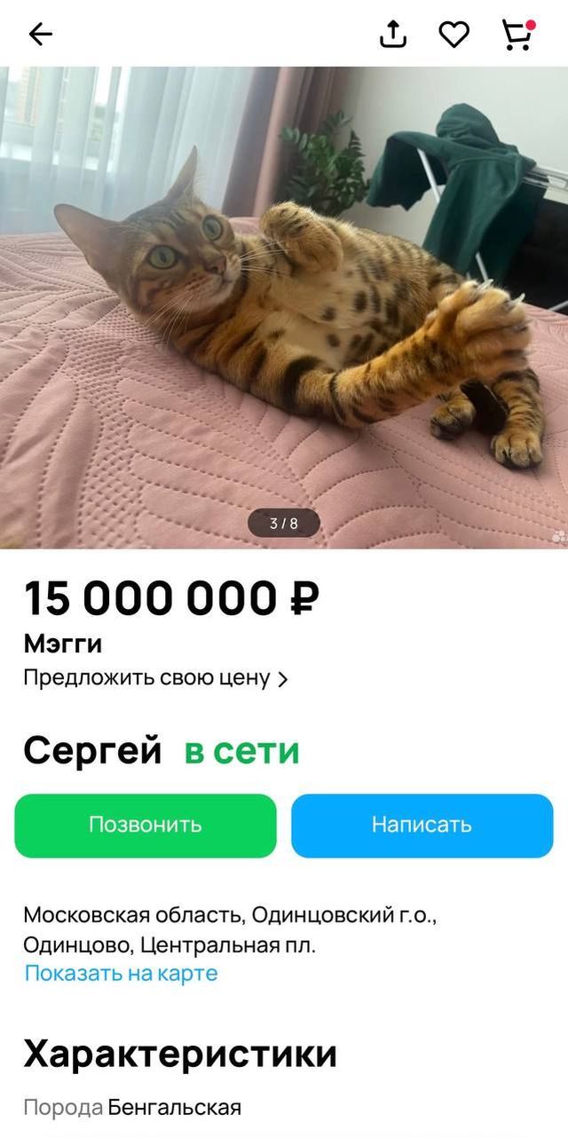 В Сети часто можно увидеть объявления из серии "отдам в добрые руки". Обычно зверушек отдают бесплатно, а иногда за символические суммы. К породистым животным это, понятное дело не относится, но порой цены... действительно кусаются! Вот, например, некий Сергей из Одинцово решил "отдать в добрые руки" свою бенгальскую кошечку Мэгги за какие-то 15 миллионов рублей. Парень также потрудился над текстом объявления. Он красочно описал котейку, которая, по его словам - "директор филиала ада на земле".