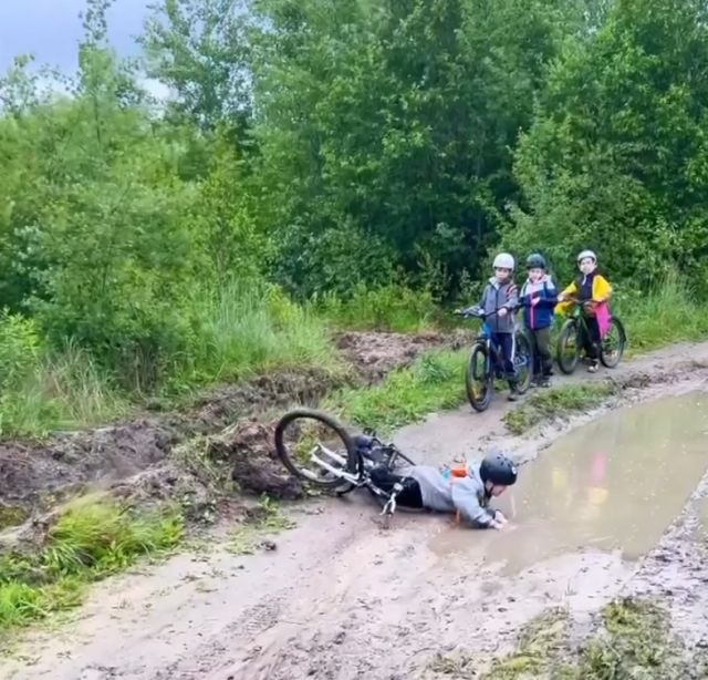 Маленький гонщик решил покорить дорогу, но судьба подложила лужу. Падение, грязь, мокрые кроссовки — и слёзы на глазах. Но оказалось, плакал он вовсе не из-за боли…
