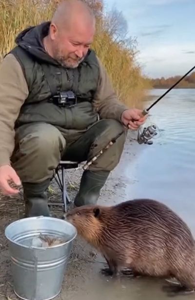 Очаровательный бобёр утащил большую рыбу у рыбака